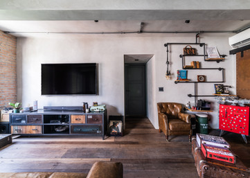 Desde o piso em assoalho de demolição, todas as paredes e tetos em cimento queimado, infraestrutura elétrica em conduítes aparentes, mobiliários com sofá, poltronas e pufs em couro, e o principal, sua grande porta de correr em aço corten, demarcam os espaços, mas de forma leve e harmoniosa, trazendo unidade e requinte.
