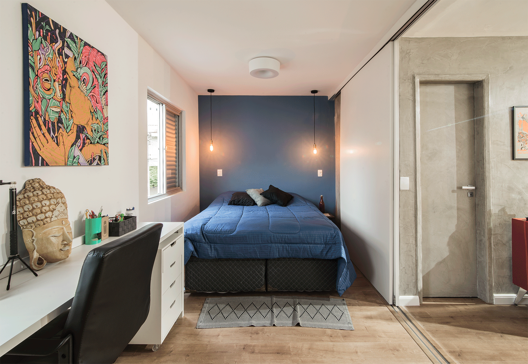 Para manter a privacidade do quarto foi elaborado um sistema com duas grandes folhas de correr, que ao serem deslocadas proporcionam o fechamento do quarto e divisão do apartamento.
