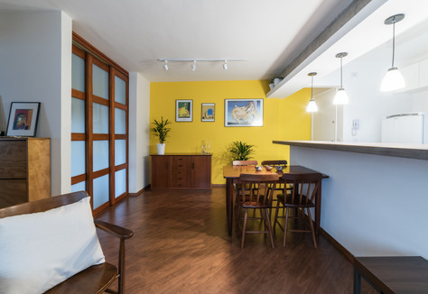 Escolhemos uma parede para servir como uma pequena galeria e expor as gravuras e a cor amarela nos pareceu a mais apropriada para combinar com as obras.