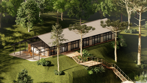 O projeto de reforma desta casa de campo em Juquitiba foi pensado a partir de uma antiga edificação já existente no terreno. Dessa forma, para haver o menor impacto ambiental possível com demolição e resíduos da obra, foi projetado o aproveitamento da casa, criando uma nova estrutura metálica para ampliar a cobertura da casa e adequá-la ao novo uso.
