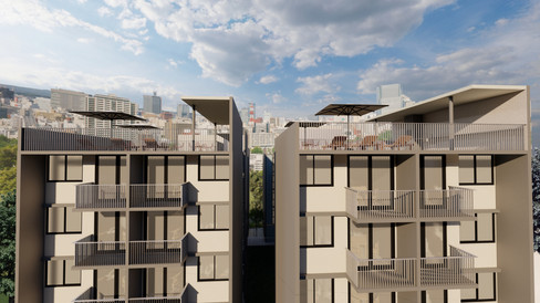 Apesar de ter dois terrenos o cliente nos solicitou que o conjunto tivesse uma unidade, que parecesse apenas um empreendimento. Partimos disso e decidimos criar dois prédios em lâminas buscando que todos os apartamentos fossem orientados para a face norte, demos unidade para o conjunto através dos materiais de acabamento e da volumetria, recuamos o muro frontal para deixarmos um pequeno balanço nos edifícios e o muro serviu como elemento que unifica os dois edifícios.